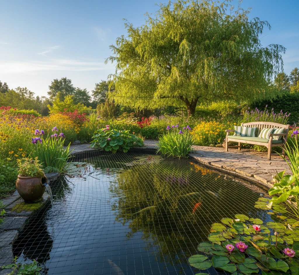 Vijvernet op maat gemaakt per M2, in dit geval een vierkante maas met een wijdte van 7.0 cm x 7.0 cm. Deze netten hebben een 8mm dik randkoord. Gemaakt van een UV gestabiliseerde 1,3mm dikke polyethyleen draad in de kleur zwart.