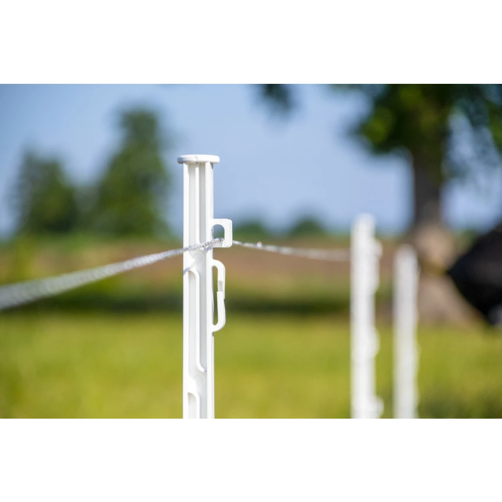 Meerdere Bevestigingspunten: De palen zijn voorzien van diverse isolatoren voor draad, koord en lint. Zo pas je de hoogte van de geleiders eenvoudig aan op jouw dieren.